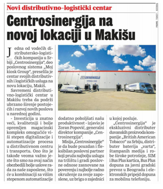 edna od vodećih distributersko-logističkih kompanija u Srbiji Centrosinergija", deo poslovnog sistema "Moj kiosk Group", preselila je centar svojih distributivnih i logističkih usluga na novu lokaciju, Makiš. Savremeni distributivno-logistički centar u Makišu treba da podrži ubrzano širenje postojećih i razvoj novih poslova u narednoj godini.