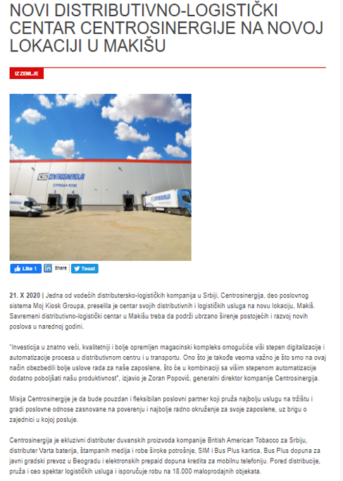 21. X 2020 | Jedna od vodećih distributersko-logističkih kompanija u Srbiji, Centrosinergija, deo poslovnog sistema Moj Kiosk Groupa, preselila je centar svojih distributivnih i logističkih usluga na novu lokaciju, Makiš. Savremeni distributivno-logistički centar u Makišu treba da podrži ubrzano širenje postojećih i razvoj novih poslova u narednoj godini.