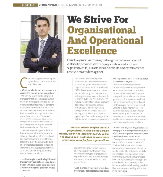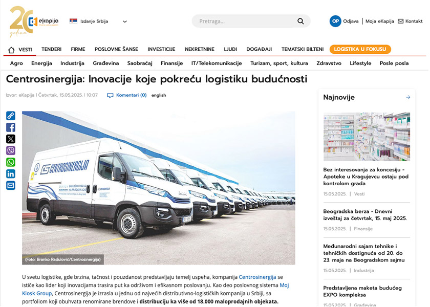 …U svetu logistike, gde brzina, tačnost i pouzdanost predstavljaju temelj uspeha, kompanija Centrosinergija se ističe kao lider koji inovacijama trasira put ka održivom i efikasnom poslovanju. Kao deo poslovnog sistema Moj Kiosk Group, Centrosinergija je izrasla u jednu od najvećih distributivno-logističkih kompanija u Srbiji, sa portfoliom koji obuhvata renomirane brendove i distribuciju ka više od 18.000 maloprodajnih objekata…
